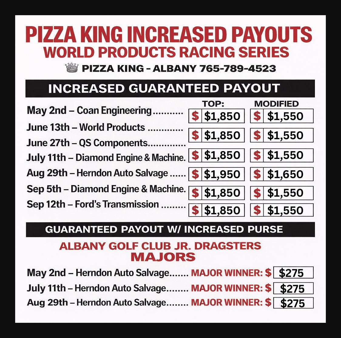 Coan Engineering INCREASED Purse… Herndon Auto Salvage INCREASED Junior Purse… World Products Racing Series… Full Racing Program